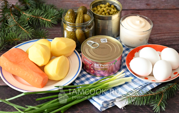 Вот такой набор продуктов нам потребуется для приготовления "Зимнего" салата с консервированной ветчиной (а-ля Оливье).
