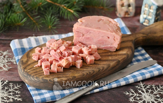 Консервированную ветчину нарежьте кубиком, так же как и остальные ингредиенты.