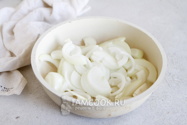 Почистите лук и нарежьте его полукольцами достаточно крупно. Выложите лук и начните его обжаривать.