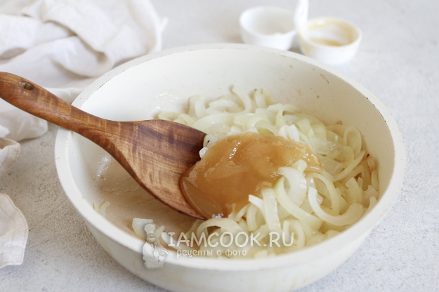 Благодаря мёду лук приобретет легкую карамельную корочку.