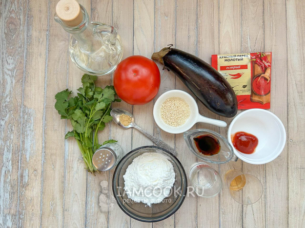 Соберите по списку все необходимые ингредиенты для приготовления азиатского салата с баклажанами и помидорами.