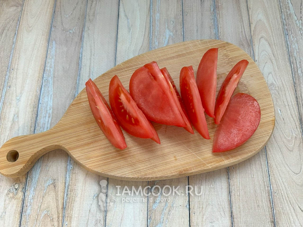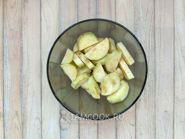 Баклажаны очистите, нарежьте полукольцами толщиной примерно 0,7-1 сантиметр. Сложите в миску, посолите и оставьте на 10 минут. После этого промойте холодной водой и отожмите.