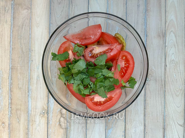Соедините в миске баклажаны с помидорами. Мелко порубите кинзу, добавьте к овощам, полейте соусом и перемешайте.