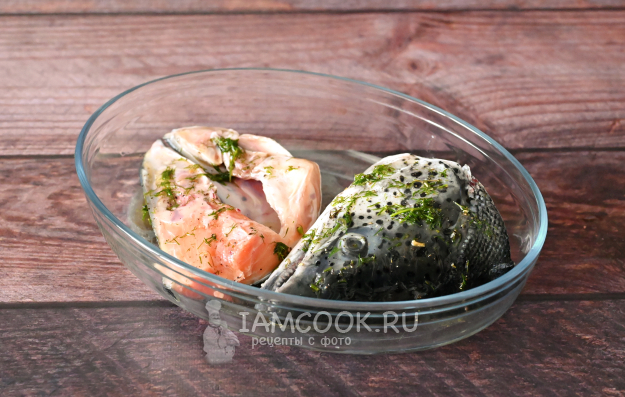 Для этого налейте в мисочку подсолнечное масло, яблочный уксус, добавьте соль и перец, приправу для рыбы и нарубленный укроп. Всё перемешайте, и маринад для запекания головы семги готов!