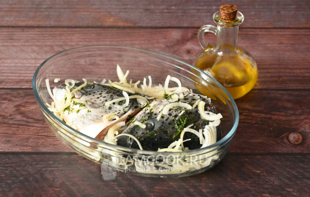 Нарежьте тонкими полукольцами лук, слегка пожамкайте его в руках и выложите в форму, равномерно распределяя. Сверху лучок можно дополнительно сбрызнуть маслом, так будет ещё вкуснее.