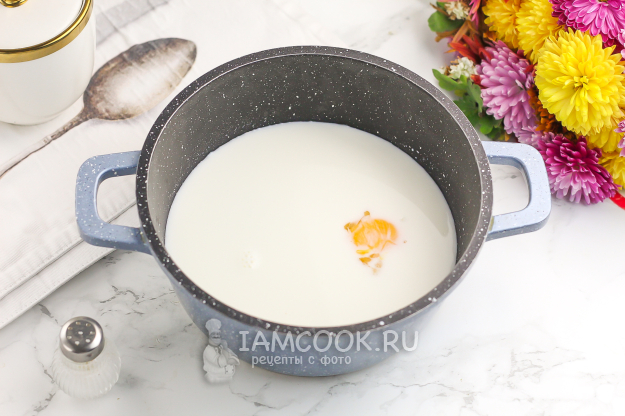 Молоко любой жирности влейте в казан или ковш с антипригарным дном. Всыпьте сахарный песок, соль, выложите желток и взбейте 2-3 минуты.
