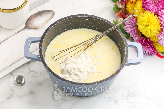 Всыпьте пшеничную муку высшего сорта, вмешайте ее в массу, но не взбивайте, чтобы не получить комочки. Помните, что молоко должно быть холодным, не теплым и не горячим, иначе мука сразу же собьется в комочки.