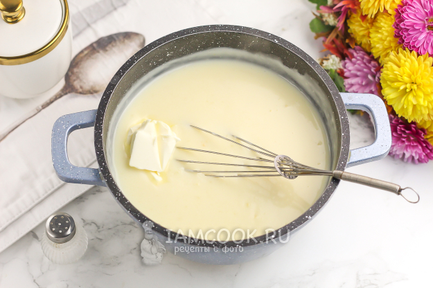 Поместите емкость на плиту, включив средний нагрев. Заварите крем в течение 12-15 минут, время от времени перемешивая его. Как только температура содержимого емкости станет высокой, крем начнет густеть. В этот момент его нужно хорошенько перемешивать, чтобы он не подгорел на дне. Выключите нагрев и вмешайте в крем сливочное масло.