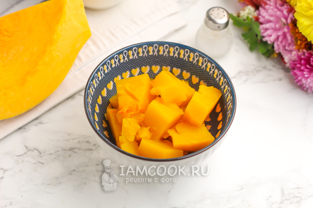 Часть тыквы очистите и промойте, нарежьте кубиками и отварите в течение 20 минут либо сварите на пару.