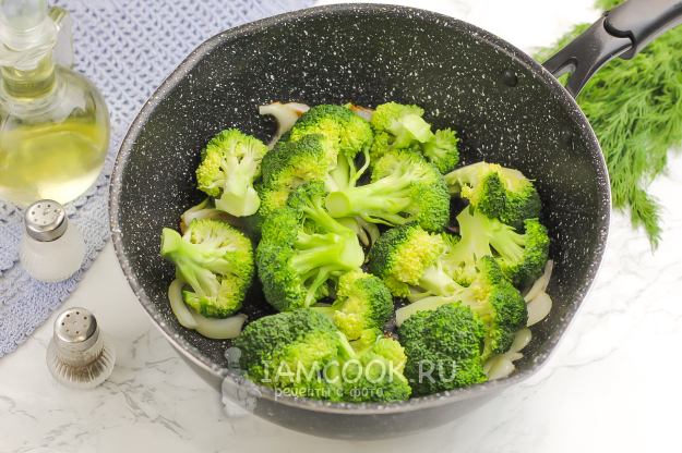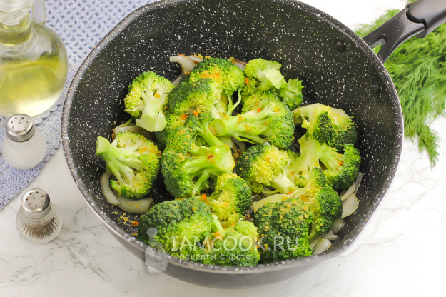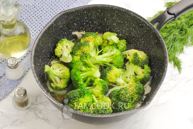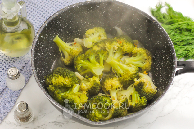 В это время промойте брокколи и разберите на соцветия. Выложите их в казан, сотейник.