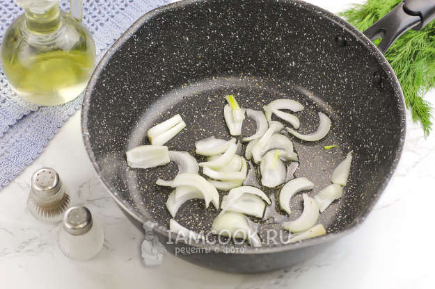 Очистите луковицу, промойте и половину нарежьте кубиком или лепестками - как вам будет угодно. Так как соус будет пюрироваться, то нарезка овощей непринципиальна. Прогрейте сковороду с высокими бортиками, сотейник или казан и влейте растительное масло. Выложите луковую нарезку и прожарьте ее 2-3 минуты, до румяности.