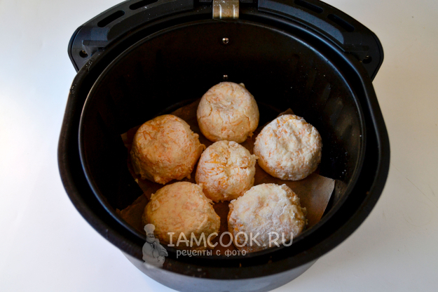 Положите заготовки сырников в чашу аэрогриля. Чашу можно предварительно смазать растительным маслом или положить сырники на пекарскую бумагу.