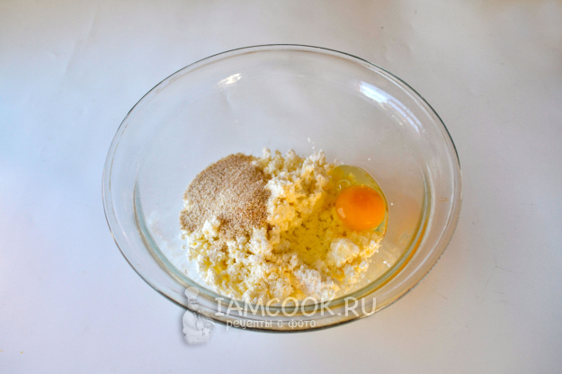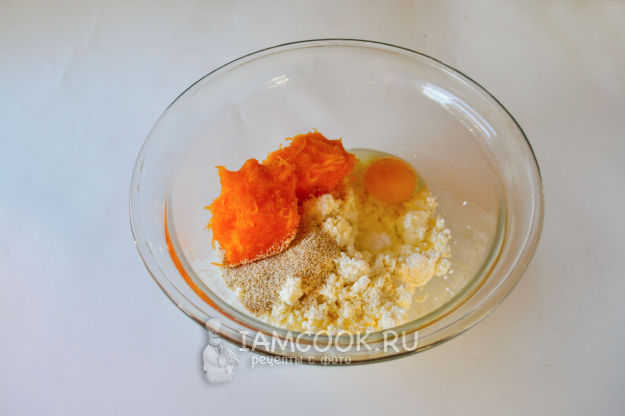 В миску положите творог, вбейте яйцо, добавьте манную крупу. У меня манка с клетчаткой. Можно взять обычную манную крупу. Сахар я не добавляю, так как тыква сладкая. Тщательно перемешайте.