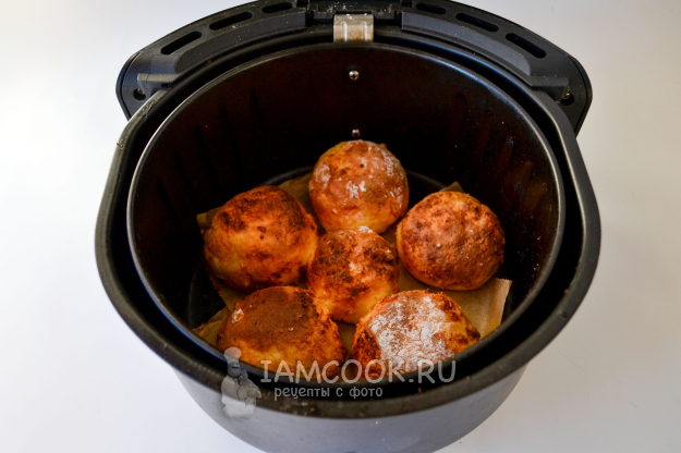 Запекайте сырники при 170°С в течение 25-30 минут. Ориентируйтесь на особенности своего аэрогриля. Готовые сырники должны быть с аппетитной румяной корочкой.