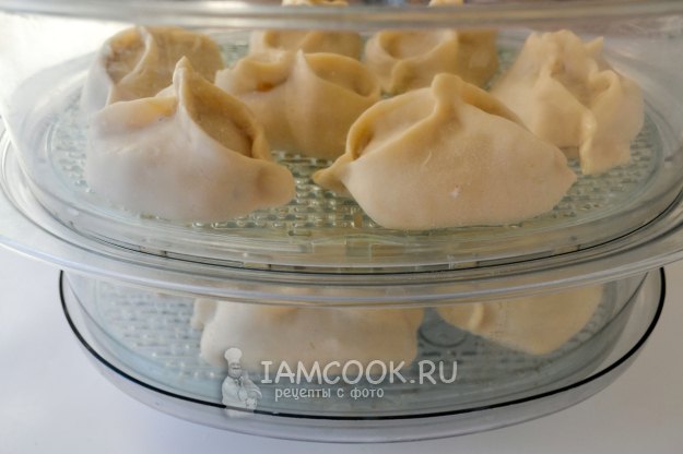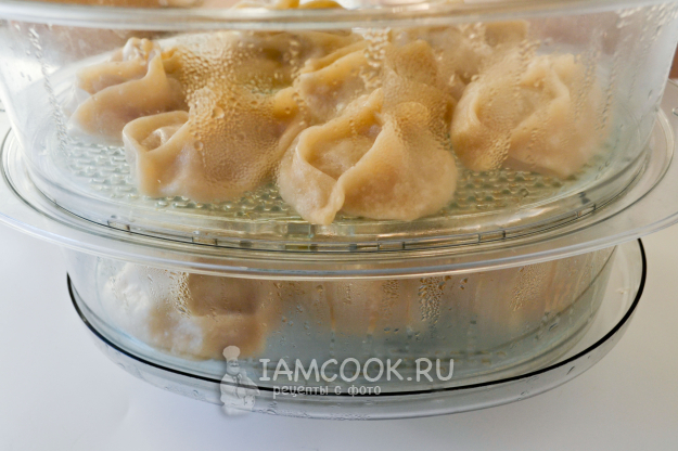 В пароварку налейте горячую воду, установите поддоны с мантами, закройте крышкой, включите прибор и установите время приготовления - 35-40 минут.