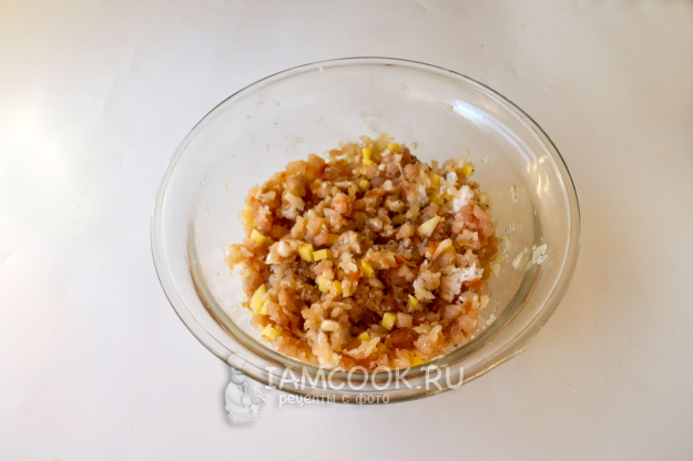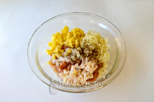 Для начинки положите щучий фарш в миску, добавьте мелко нарезанный репчатый лук, одну небольшую картофелину, очищенную и нарезанную мелким кубиком. Добавьте соль и черный молотый перец.