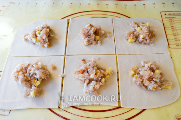 Тесто разделите на 3 равные части. Одну часть раскатайте в прямоугольник на посыпанной мукой доске. Разрежьте пласт теста на квадраты со стороной примерно 8-10 см. В центр каждого квадрата положите начинку.