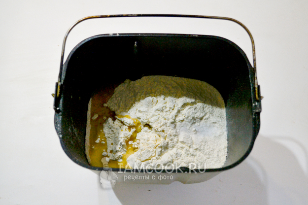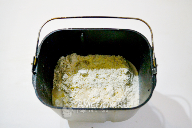 Первым делом приготовьте тесто. Для замешивания теста я буду использовать хлебопечку. В ведерко хлебопечки насыпьте пшеничную муку, добавьте растительное масло, соль.