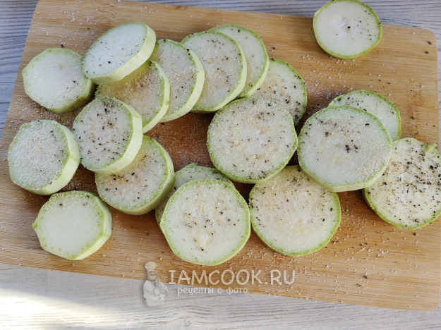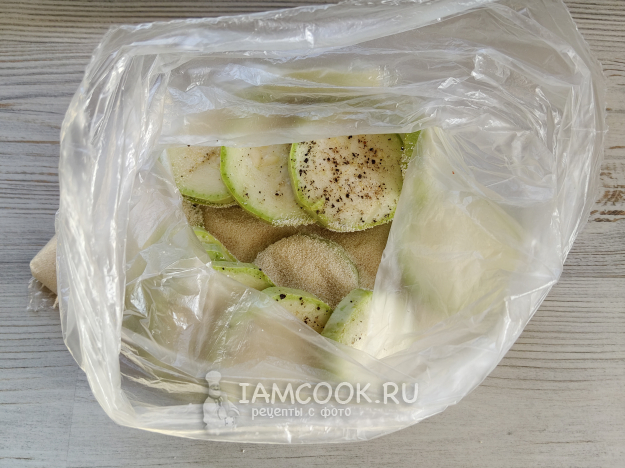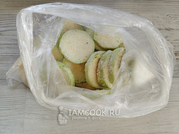 Потрясти пакет, чтобы кабачки покрылись манкой.