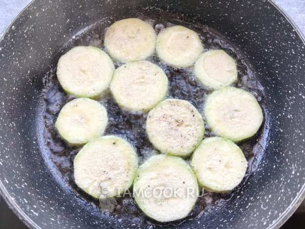 Жарить кабачки на сковороде в горячем масле до румяного состояния.