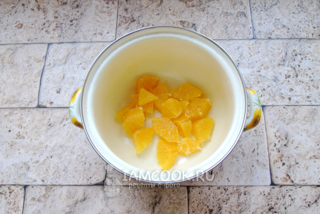 Апельсин помойте, очистите от кожуры и белых пленок. Обязательно уберите косточки, если они есть. Мякоть апельсина нарежьте произвольно и выложите в кастрюлю.