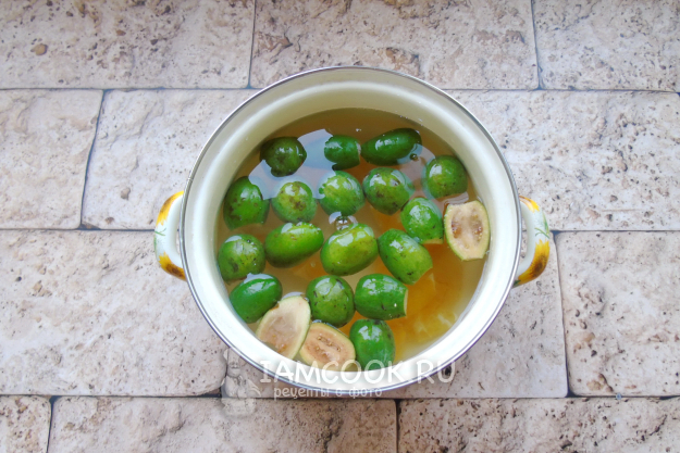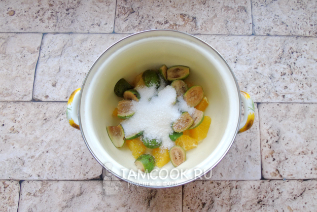 Фейхоа помойте, обрежьте хвостики, разрежьте на две половинки и добавьте к апельсину.