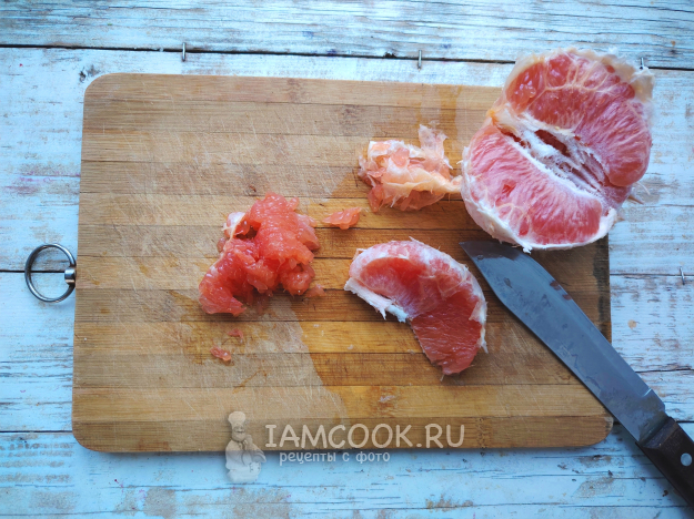 Грейпфрут обязательно нужно разобрать на зубки, и с каждого снять пленочку, используя для варенья только мякоть. Потому что основная горчинка содержится именно в пленочках, защищающих мякоть фрукта.
