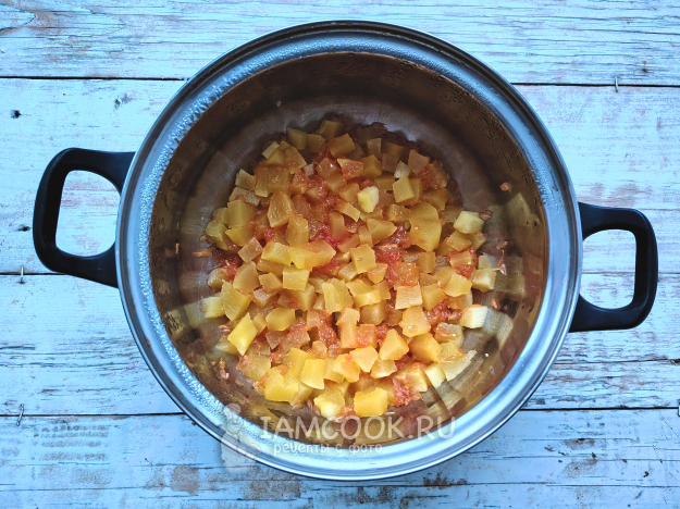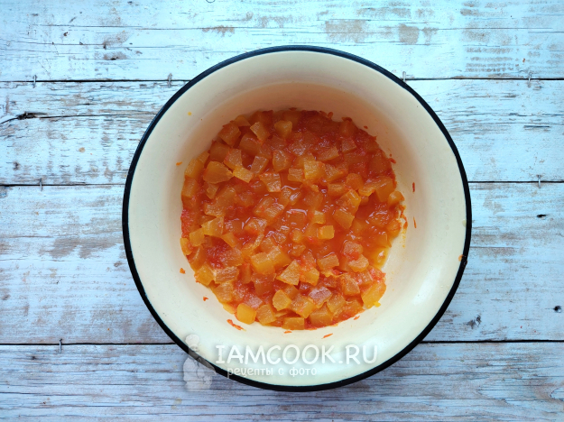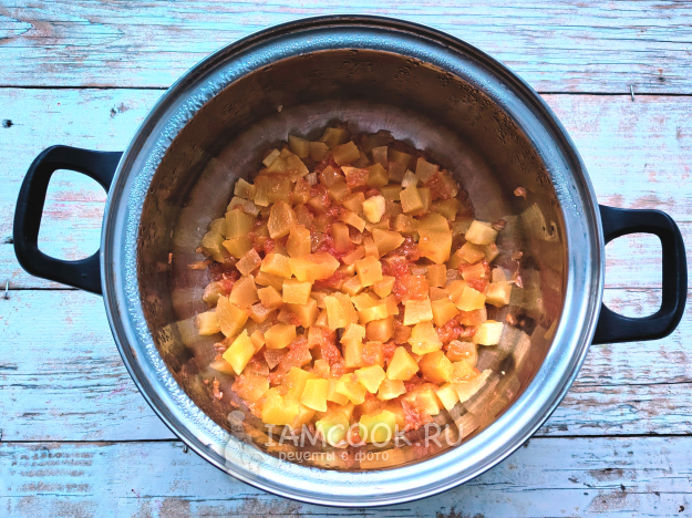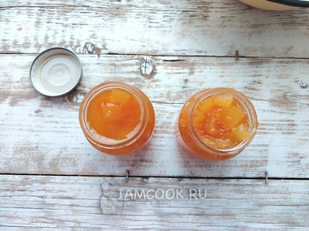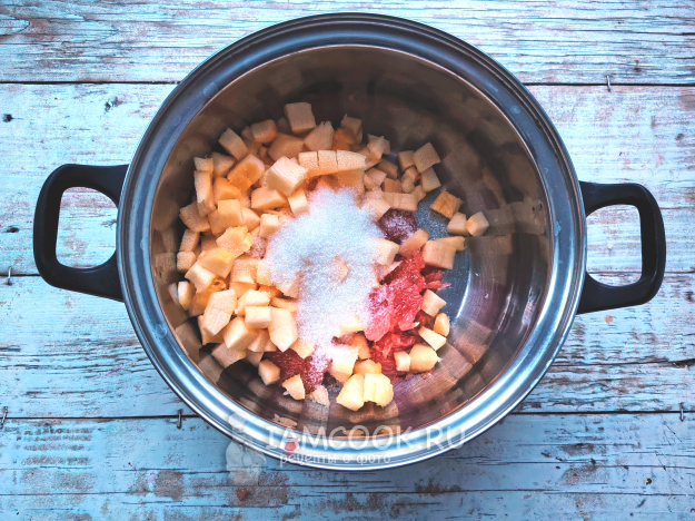 Поместить подготовленные фрукт и овощ в кастрюлю, всыпать сахар, поставить на огонь. Довести смесь до кипения, убавить огонь до минимального, проварить смесь 30 минут, выключить огонь.