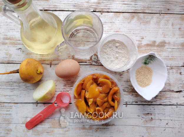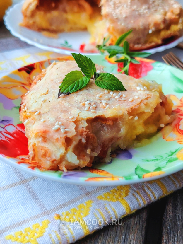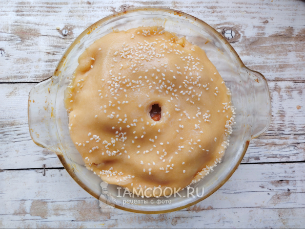 Закрыть вторым коржом. Сделать в центре отверстие, чтобы выходил пар во время выпекания. Смазать пирог взбитым яйцом, присыпать кунжутом. Выпекать пирог с репой при температуре 180 градусов около 35-40 минут.