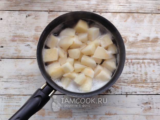 Репу почистить, нарезать на кубики, поставить отвариваться в подсоленной воде. Варить до мягкости овоща.
