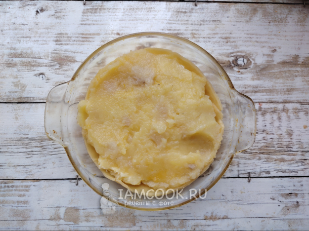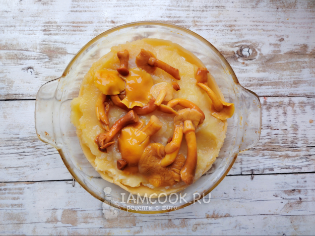 Выложить сверху пюре из репы, мелко рубленный лучок и маринованные грибы.