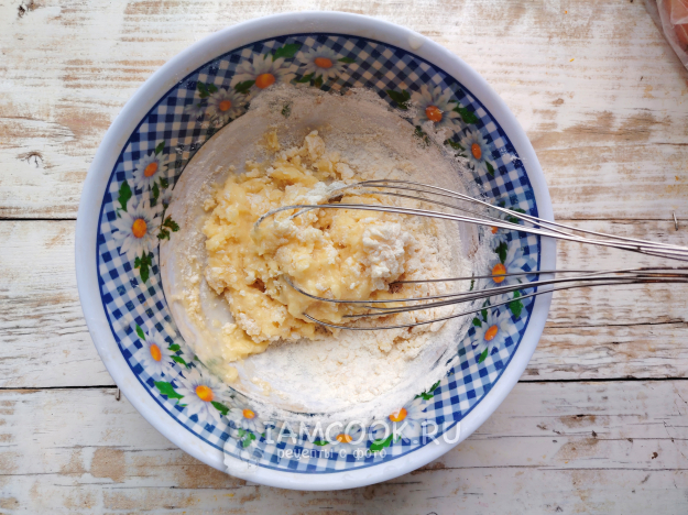 Всыпать муку, предварительно обязательно просеянную. Также добавить разрыхлитель, чтобы тесто получилось мягким и более воздушным.