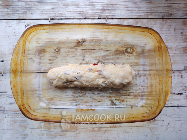 Выложить тесто в смазанную маслом форму в виде узкого и тонкого батона. Форму нужно использовать просторную, батон значительно увеличится в размере в процессе выпекания.