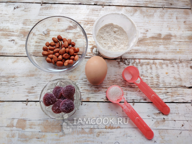 Собрать продукты для приготовления печенья бискотти с мармеладом (вишневым). Орешки можно использовать дробленые грецкие или фундук.