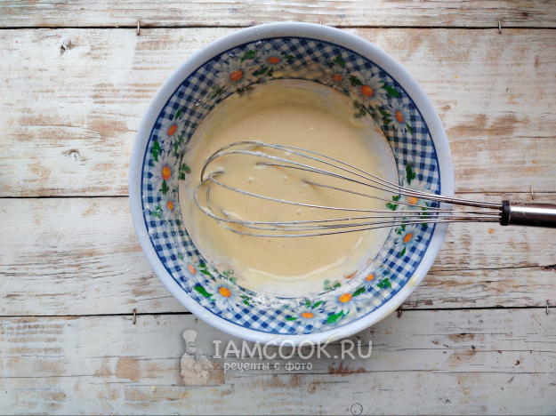 Влить немного молока, перемешать. Всыпать часть муки, предварительно просеянной и соединенной с разрыхлителем.