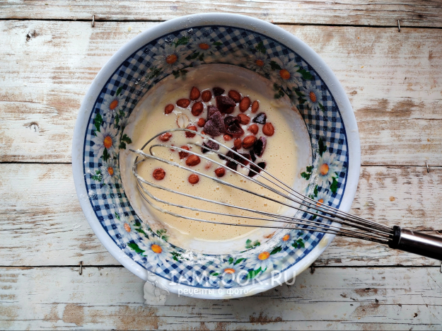 Добавить мелко порубленный мармелад и орехи. Перемешать, чтобы они равномерно распределились по массе.