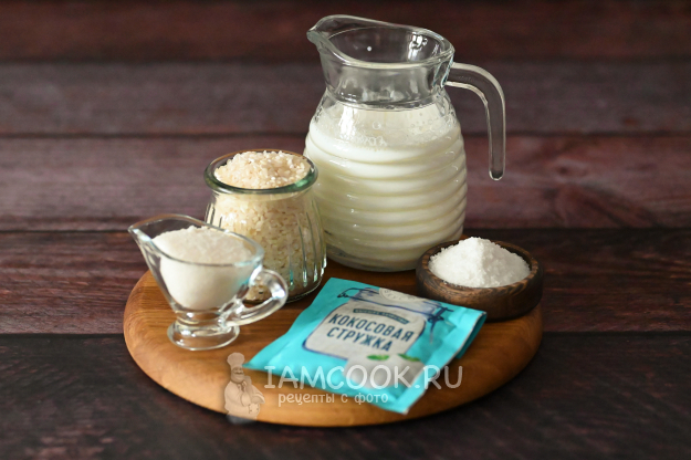 Соберите необходимые продукты для приготовления рисовой каши с кокосовой стружкой.