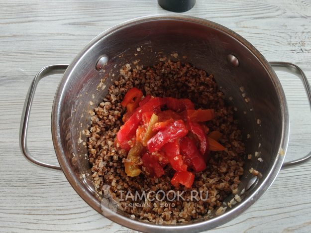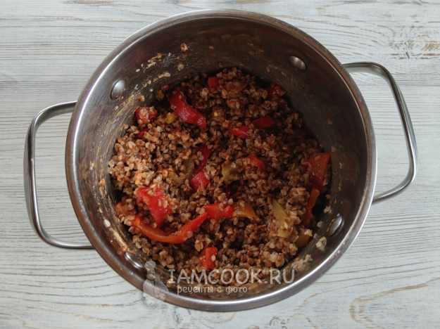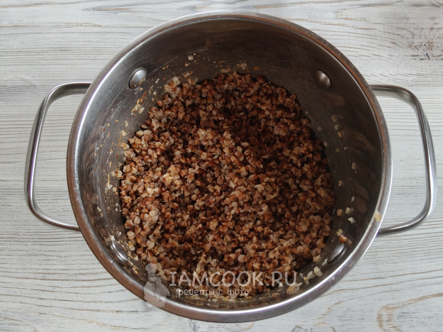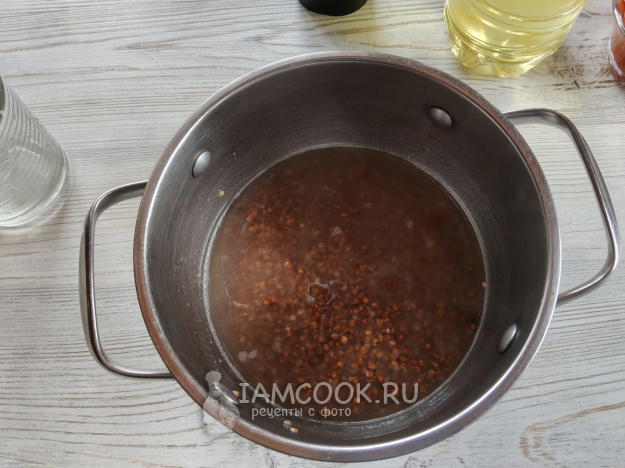 Закрыть кастрюлю крышкой, варить гречку до испарения воды на среднем огне. Подсолить.
