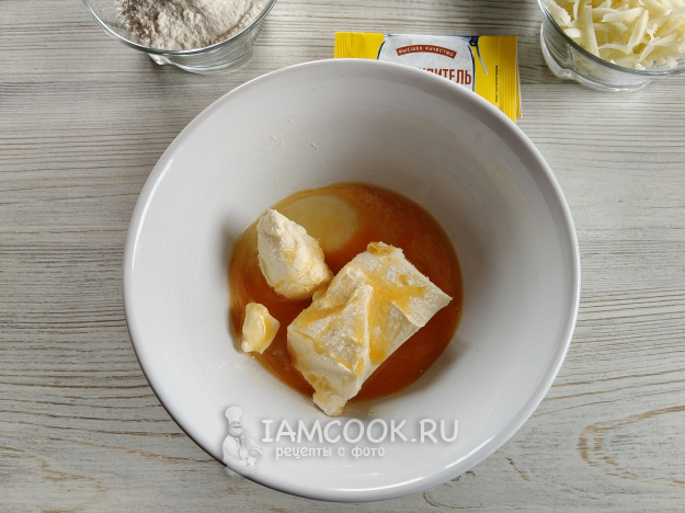 Для теста смешать мягкое масло, соль и яйцо.