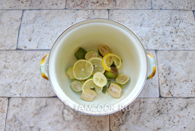 Лимон помойте и нарежьте кружками, обязательно удалите косточки. Добавьте в кастрюлю с фейхоа.