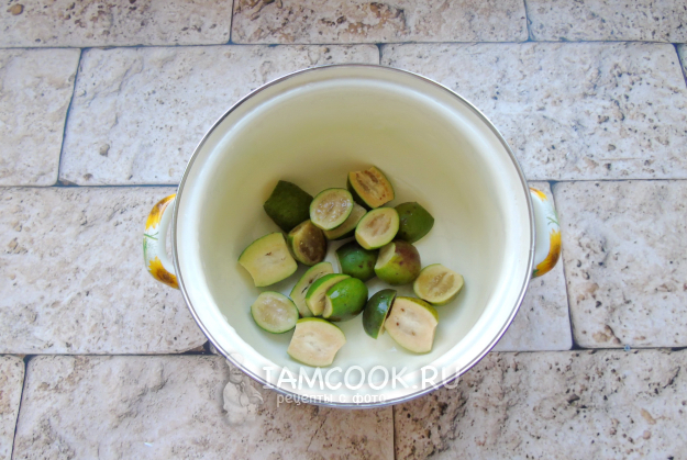 Фейхоа помойте, обрежьте хвостики и разрежьте пополам каждую ягоду. Выложите в кастрюлю.