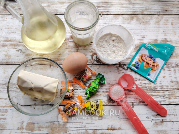 Собрать по списку продукты для пирога-разборника с конфетами и дрожжевого теста.