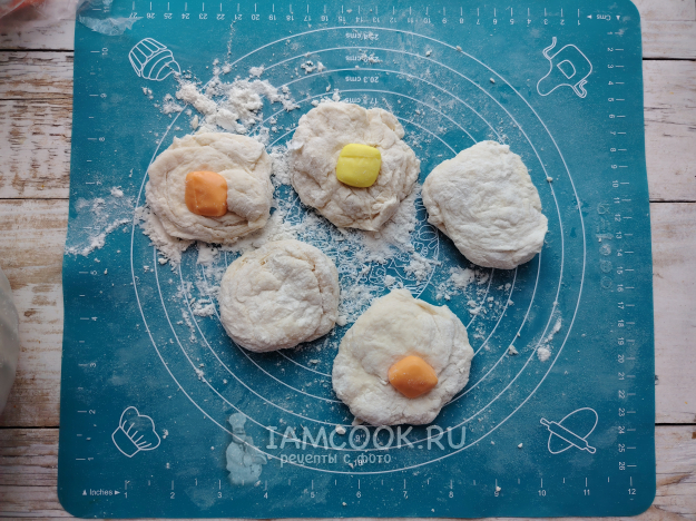 Готовое тесто разделить на части, руками растянуть каждый кусочек в лепешку, в центр положить конфету. Защипнуть края, придавая заготовке форму шарика.