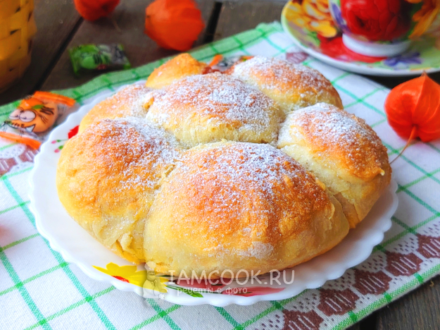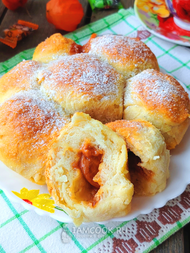 Когда разборник немного остынет (начинкой из подтаявшей карамели можно обжечься), посыпать его сверху сахарной пудрой. Подать к столу. Приятного аппетита!