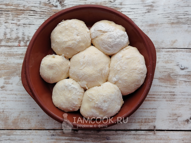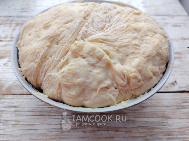 Накрыть миску с тестом пленкой и оставить на два часа в теплом месте. Периодически проверять состояние заготовки. Если тесто значительно вырастет, обмять его, выпустив воздух проколом ножа или вилки.