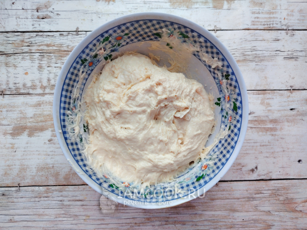 Частями всыпать оставшуюся муку, вымешать до получения плотной массы, но вымешивать тесто до тугого на данной стадии не нужно, чтобы не затруднять процесс роста дрожжевого теста.