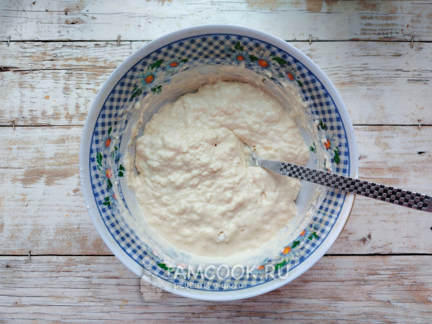 Соединить смеси с опарой, всыпать часть просеянной муки и соль. Размешать смесь.