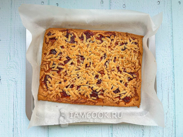 Достаньте часть теста из морозилки и натрите на крупной терке поверх варенья.