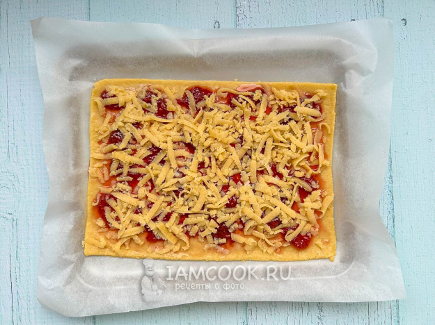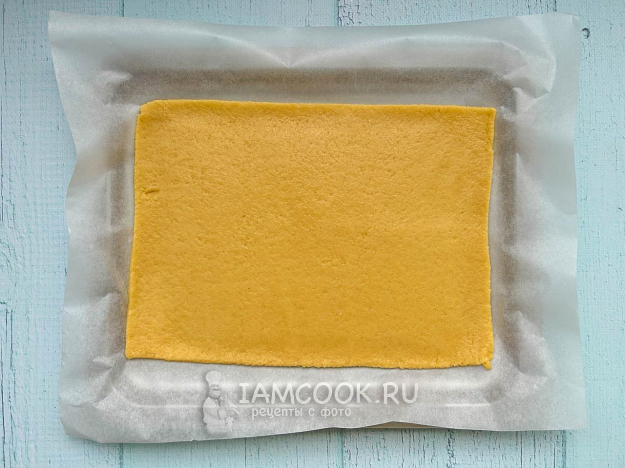 Оставшуюся часть теста раскатайте в тонкий пласт толщиной примерно 1 сантиметр. Обрежьте края и выложите на пергамент.