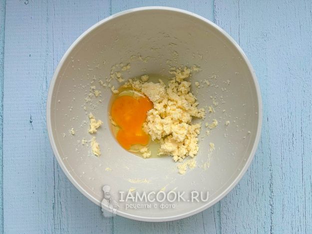 К мягкому сливочному маслу добавьте сахар и взбейте до однородной массы, затем, продолжая взбивать, добавьте яйцо и соль.